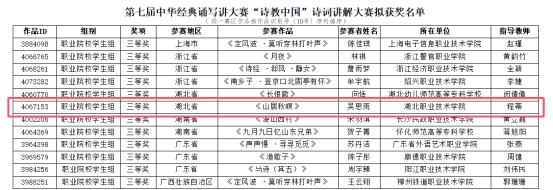 (本网讯 程蒂 聂静)近日,由教育部、国家语言文字工作委员会联合主办的第七届中华经典诵写讲大赛“诗教中国”诗词讲解大赛全国获奖名单揭晓。由我校公共课部程蒂老师指导、教育与艺术学院吴思雨同学完成的作品《山居秋暝》,历经逐级选拔和专家严格评审,最终荣获全国职业院校学生组三等奖。这是我校学子在首次斩获该赛事省级奖项后,实现的又一重要突破。